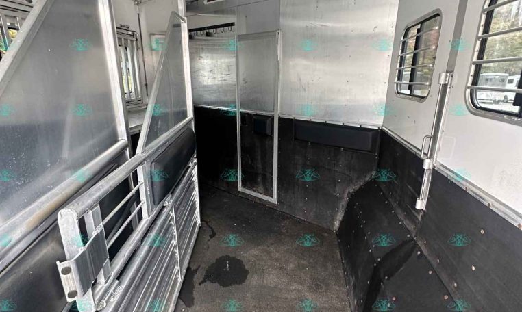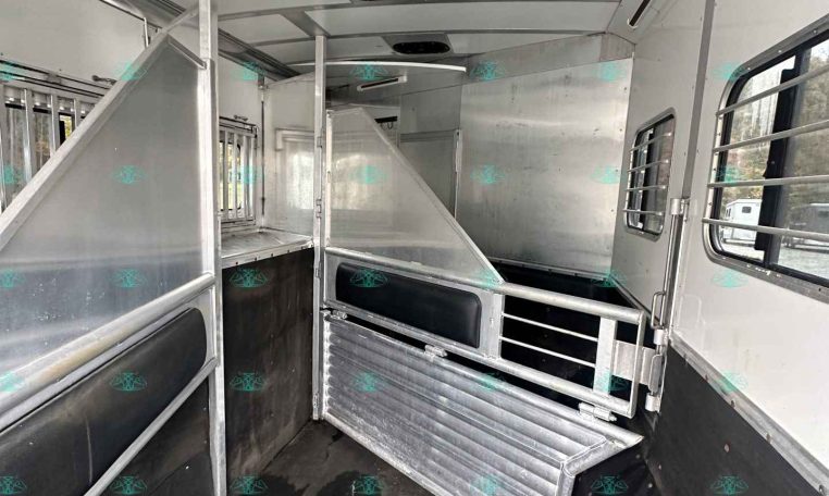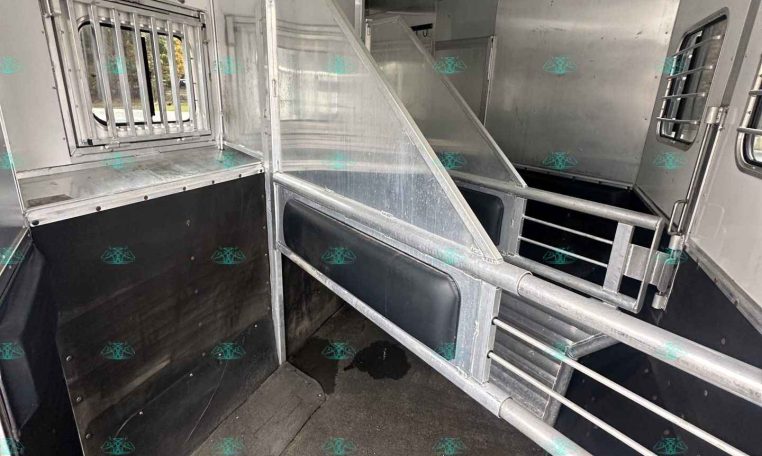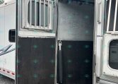 Looking for a roomy trailer with a homey feel? This 2010 Adam 8314 3 Horse Slant Load trailer offers a full 14’ living quarters, all-aluminum construction, and stunning real hickory wood cabinetry. At 8’ tall and 8’ wide, it’s perfect for larger horses and comfortable overnight stays at shows or on the road.