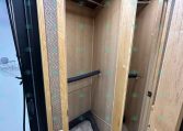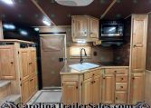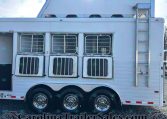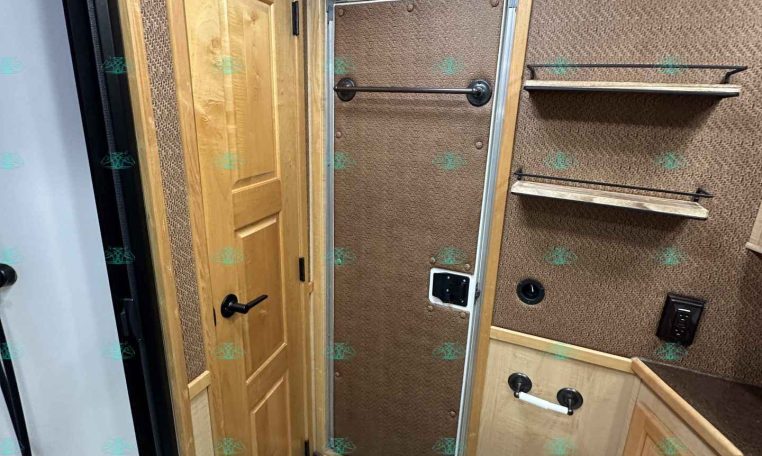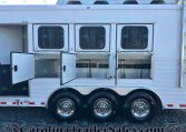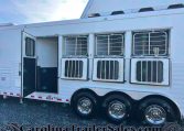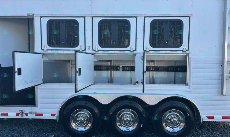 This trailer is packed with extra features like a hydraulic jack, awning, manger storage, rear fold-up tack, swing-out saddle rack, blanket bar, brush box, WERM flooring, and drop-down windows on both sides. Upgrades include a keyless entry, remote thermostat with app, motion sensor porch light, tire pressure sensors, and a Shocker hitch.