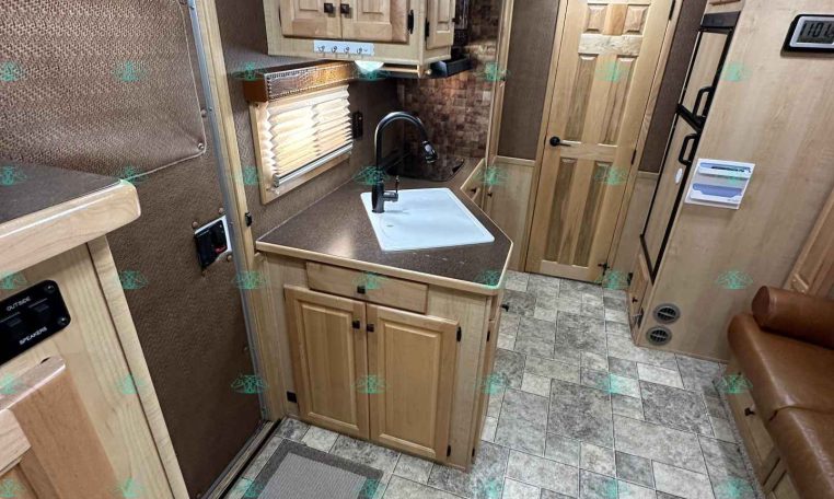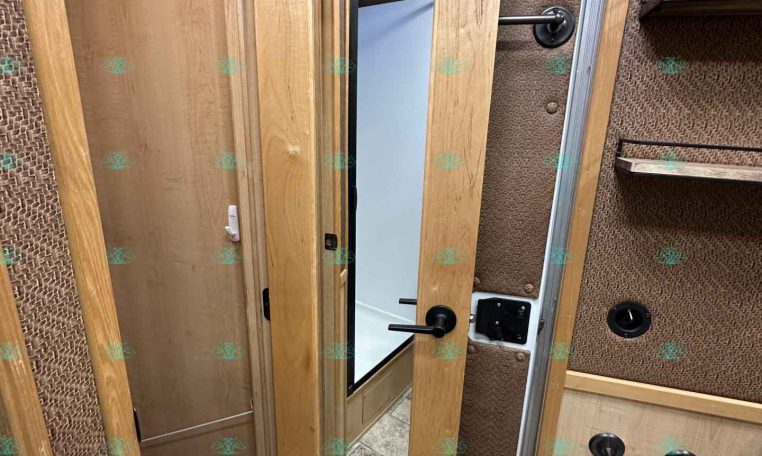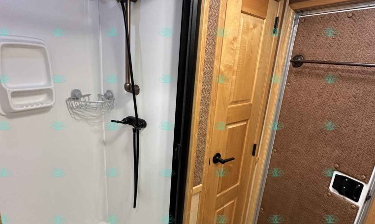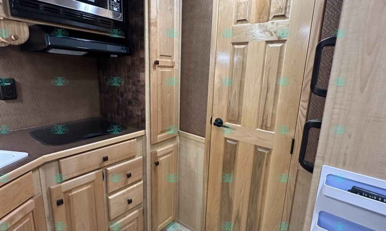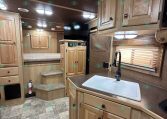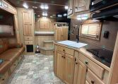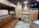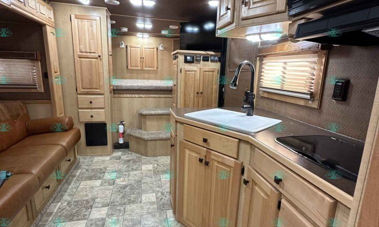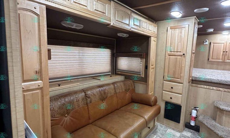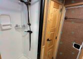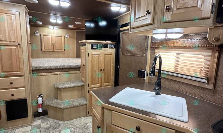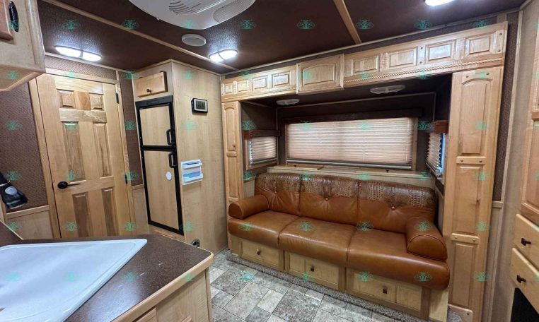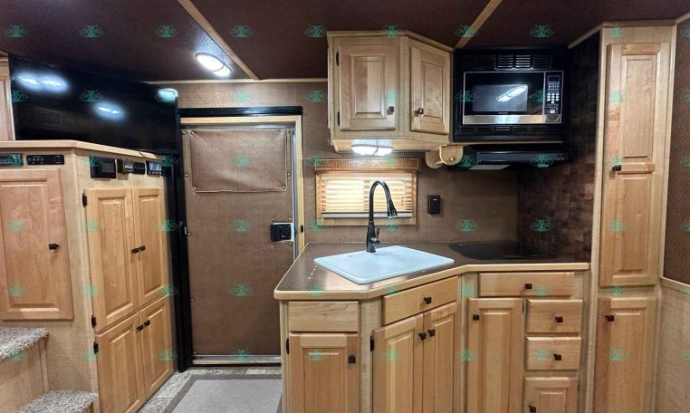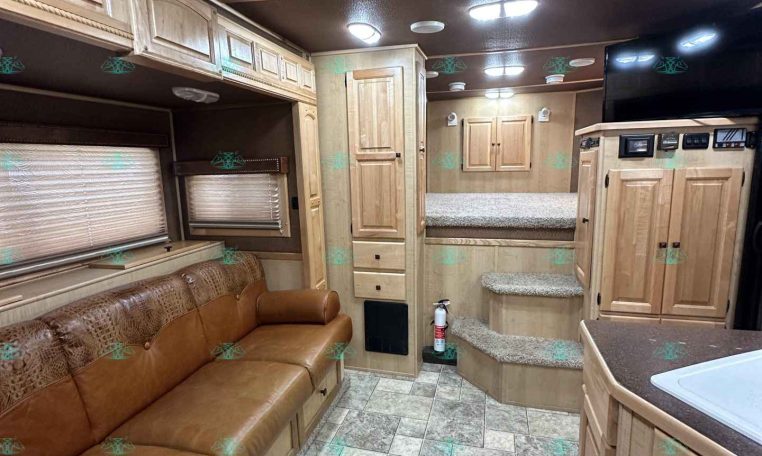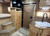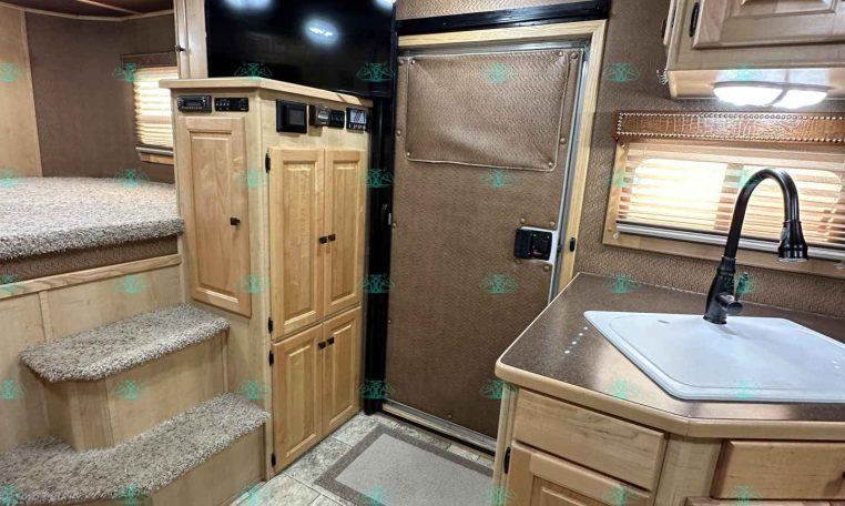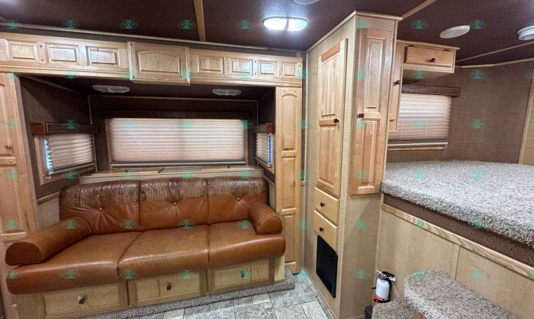 Inside the living quarters, you’ll find real wood cabinetry, a slide-out with a sofa that makes a bed, a big refrigerator, double sinks, a two-burner glass cooktop, microwave, TV, and tons of storage. The solid bathroom door leads to a walk-in closet with a mirror, a square shower, sink, vanity, and toilet. Additional comfort features include ducted AC, propane furnace, and water heater.