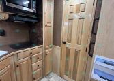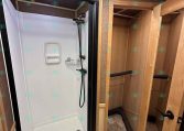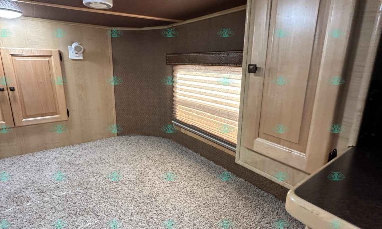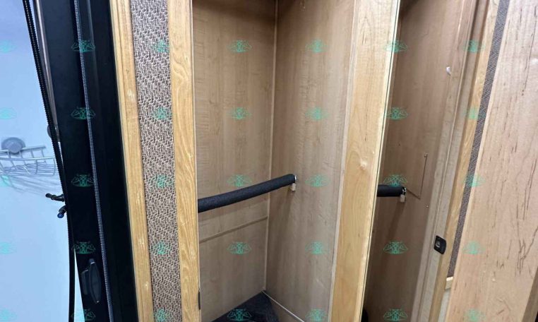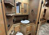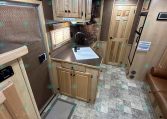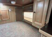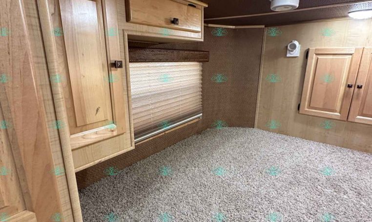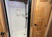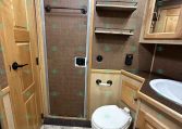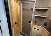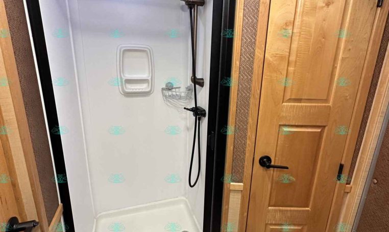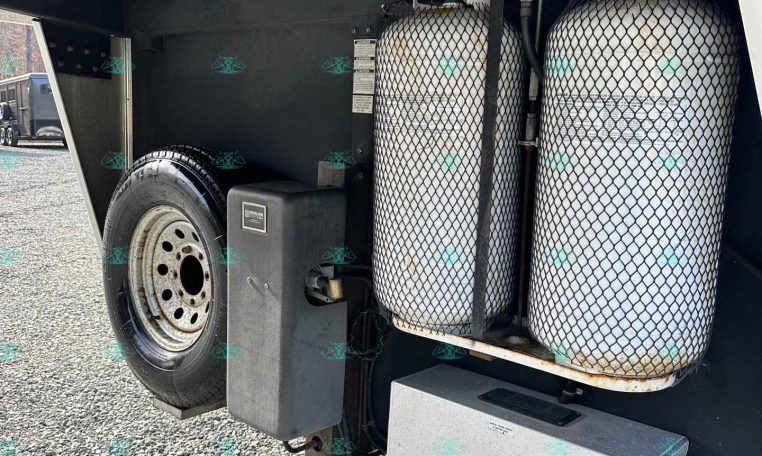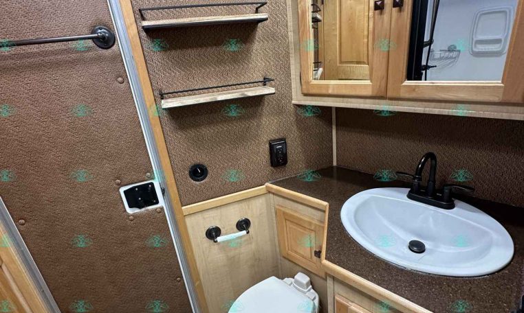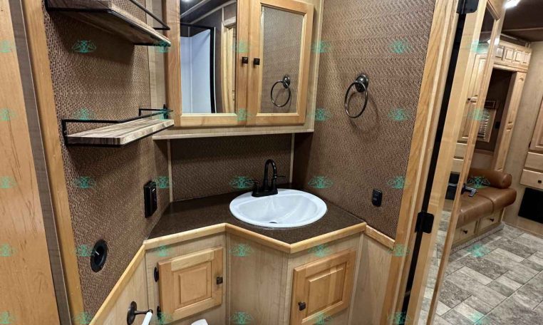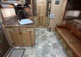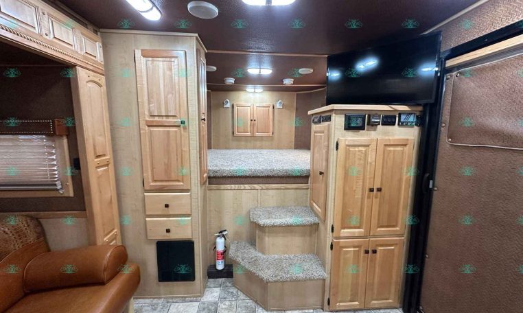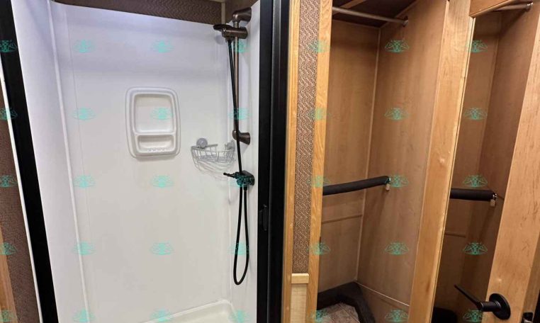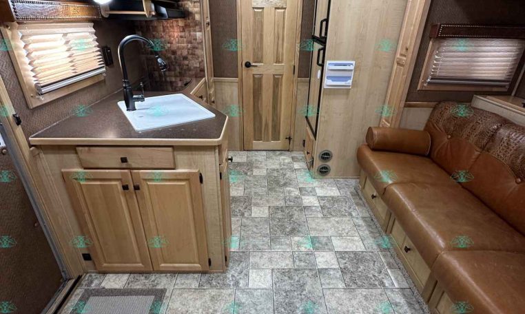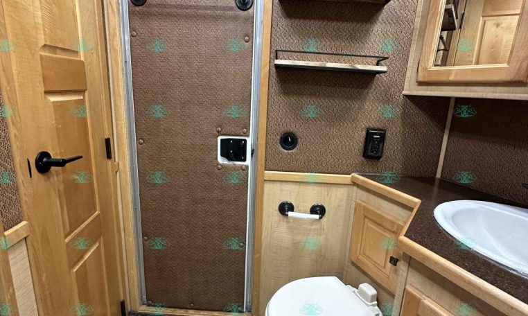 Inside the living quarters, you’ll find real wood cabinetry, a slide-out with a sofa that makes a bed, a big refrigerator, double sinks, a two-burner glass cooktop, microwave, TV, and tons of storage. The solid bathroom door leads to a walk-in closet with a mirror, a square shower, sink, vanity, and toilet. Additional comfort features include ducted AC, propane furnace, and water heater.