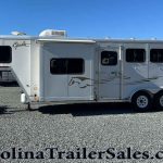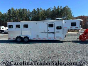 Inside the LQ, you’ll find a cozy space with a sofa sleeper, AC, propane heat, cooktop, microwave, and a full bathroom with a shower and toilet. The horse area is just as functional with drop windows, padded dividers, rear tack, escape door, and fresh water tank and pump for convenience on the road.