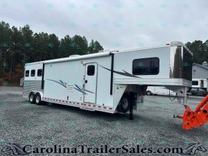 This Pre-Owned 2001 Silver Star Star Lite is a 4 horse slant load trailer with an 8’ full living quarters setup, offering comfort, storage, and convenience at an affordable price. Built all-aluminum and equipped with a hydraulic jack, this trailer is easy to haul and perfect for weekend trips or show circuits.