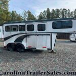 Inside, the trailer includes padded walls, a head divider, padded stall divider, and removable feed bags. You’ll also find three slider windows on each side, allowing great airflow. The front dressing room offers a saddle rack, bridle hooks, and 110v electrical outlets—perfect for weekend rides or short hauls.