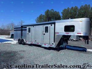 Stock# 3219Looking for a compact and lightweight 3 horse trailer with full living quarters? This Pre-Owned 2022 Shadow 69220S-3SL-GN-E-LQ model is an ideal match. All-aluminum construction means it’s built to last and easy to tow. The trailer features a small hydraulic slide-out that creates extra space inside the living quarters while still staying maneuverable and practical. It’s been gently used, is super clean, and ready to hit the road.